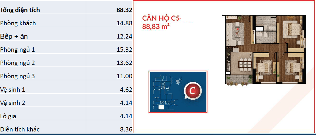 Diện tích đa dạng: 72m2-136m2 (từ 2-3 ngủ)