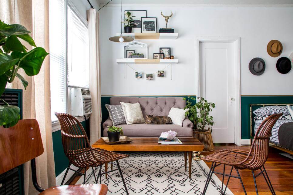 Một chiếc kệ nhiều tầng treo trên tường sẽ là nơi thích hợp để đặt chén cốc hay những cuốn sách. Một chiếc tủ đứng sẽ là nơi để quần áo và các đồ dùng cá nhân. Một tấm thảm lớn trải sàn sẽ giúp tạo cảm giác không gian được nới rộng hơn.